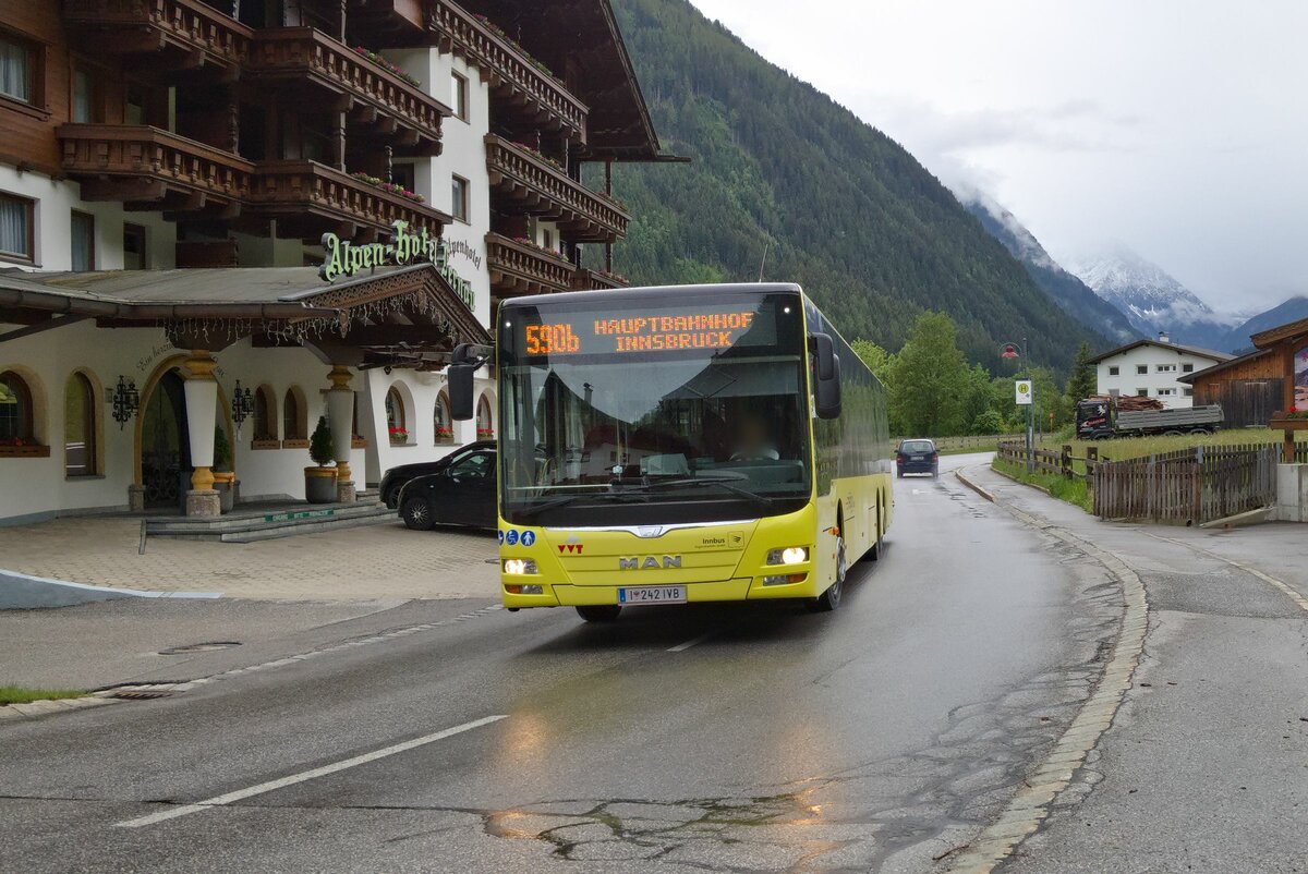 MAN Niederflurbus 3. Generation (Lion's City) von Innbus Regionalverkehr/Innsbrucker Verkehrsbetriebe (Bus Nr. 242) als Linie 590b bei der Haltestelle Neustift Fernau. Aufgenommen 30.5.2022.
