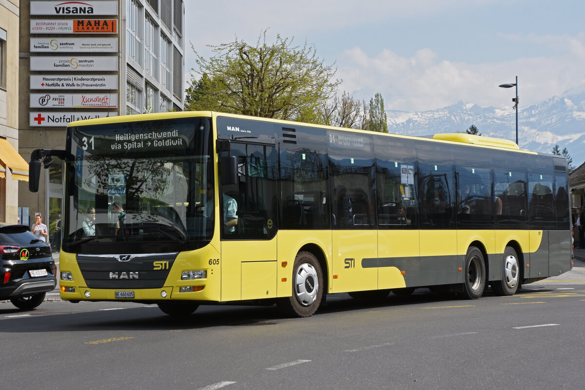 MAN Lions City 605, auf der Linie 31, verlässt die Haltestelle beim Bahnhof Thun. Die Aufnahme stammt vom 21.04.2022.