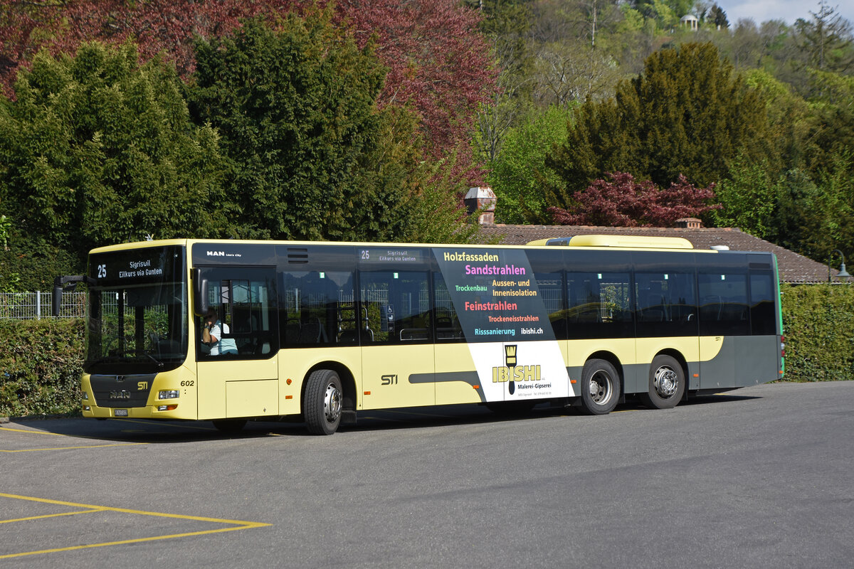 MAN Lions City 602, auf der Linie 25, wartet auf einem Parkplatz auf die nächste Abfahrtszeit. Die Aufnahme stammt vom 21.04.2022.