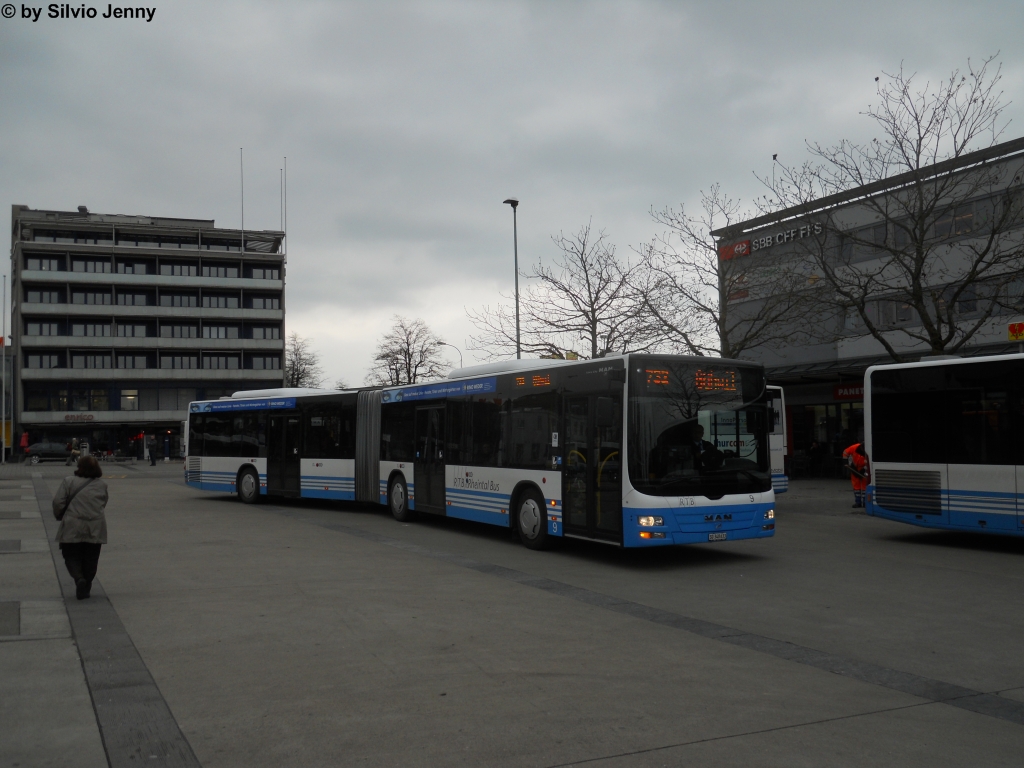 WilMobil/Rheintal Bus AG Nr. 9 (MAN Lion's City G A23) am 30.3.2012 beim Bhf. Wil SG. Während 6 Monaten ist die Bahnlinie Wil-Weinfelden infolge Bauarbeiten unterbrochen. Der Bahnersatz wird grösstenteils mit Gelenkbussen von WilMovil gefahren. Da diese aber zuwenig Gelenkbusse besitzen kommen auch solche vom Partnerunternehmen Rheintalbus in Wil zum Einsatz.