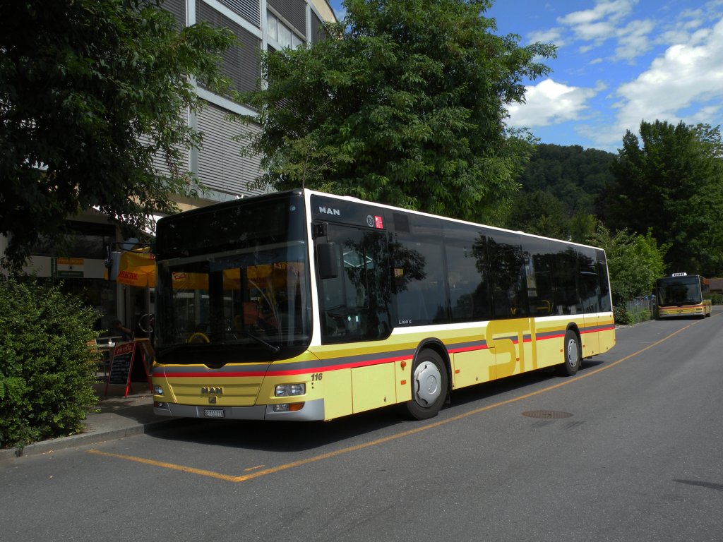MAN Bus mit der Betriebsnummer 116 auf einem Abstellplatz am Bahnhof Thun. Die Aufnahme stammt vom 04.08.2012.
