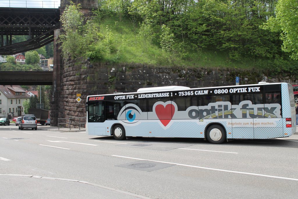 Linien Bus der Firma Rexer Reisen aus Calw mit Neuer Werbung vom Optik Fux am 10.05.2013.