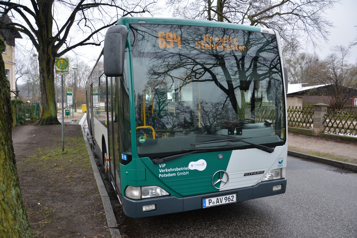 P-AV 962 steht am 30.01.2015 an der Küsselstraße in Potsdam. Aufgenommen wurde ein Mercedes Benz Citaro G ex HVG.