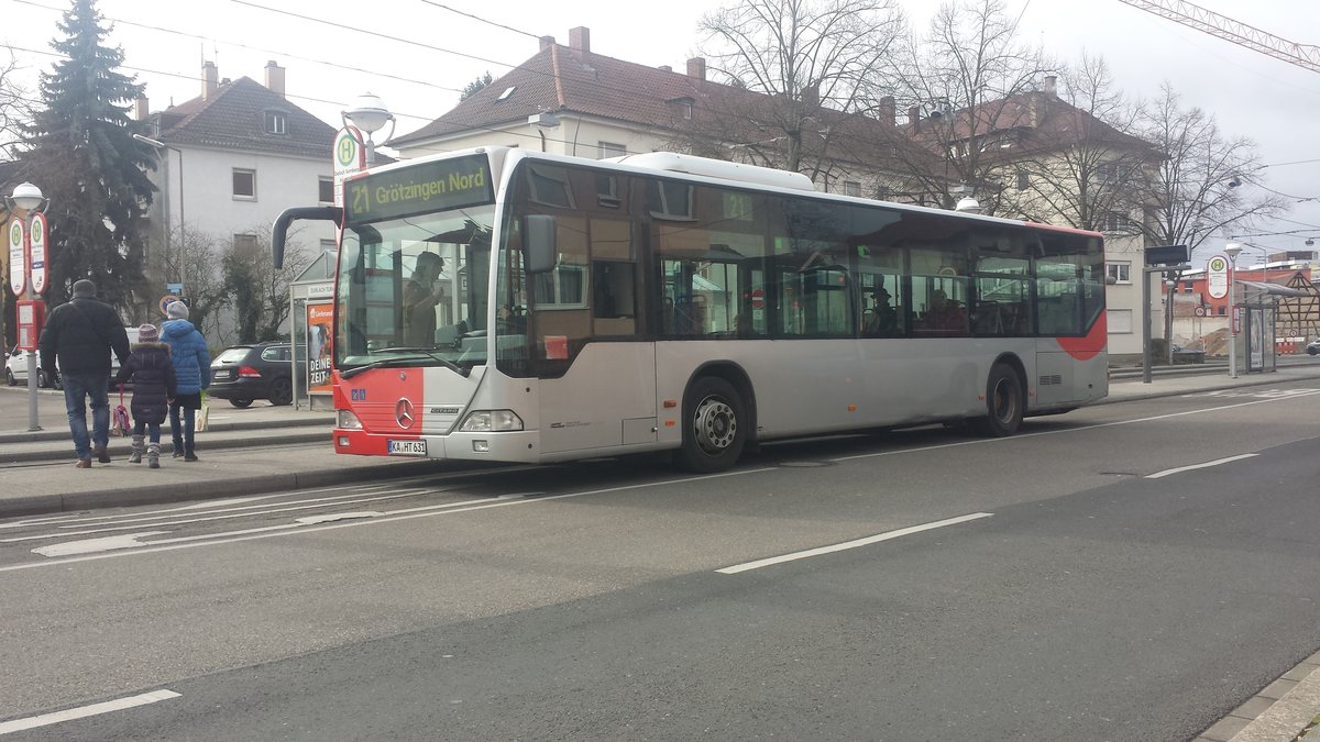 Hier der KA HT 631 von Hagro Transbus in Karlsruhe Durlach auf der Buslinie 21 nach Grötzingen Nord. Hier gesichtet am Durlach Turmberg am 11.02.2018.