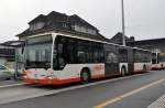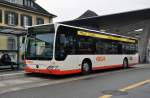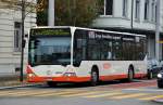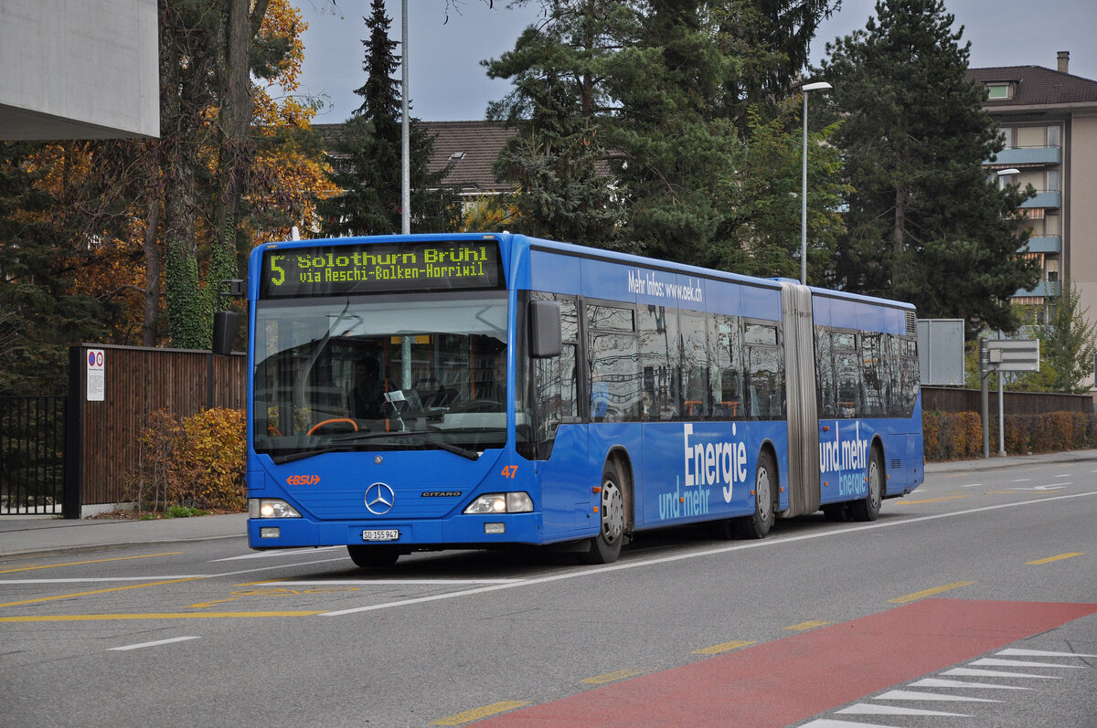 Mercedes Citaro 47 mit der Energie und mehr Werbung, auf der Linie 5, fährt am 08.11.2012 zur Haltestelle beim Bahnhof Solothurn.