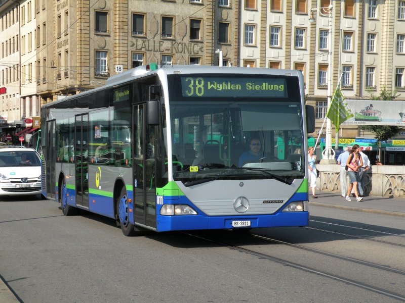 Mercedes Citaro von Lugano, fährt neu bei den BVB. Hier Bus Nr 811 auf der Mittlerenbrücke auf der Linie 38 nach Wylen Siedlung.