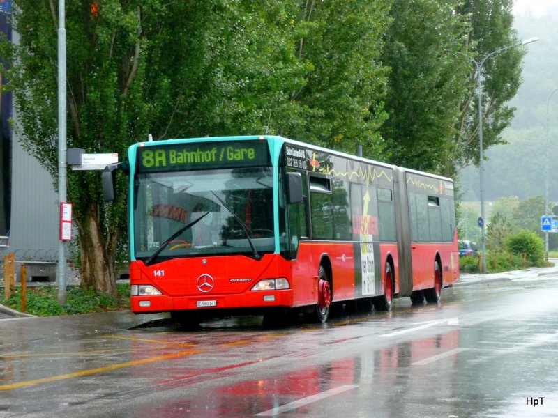 VB Biel  - Mercedes Citaro Nr.141  BE 560141 auf der Linie 8A bei Starkem Regen unterwegs in Brügg am 03.09.2009