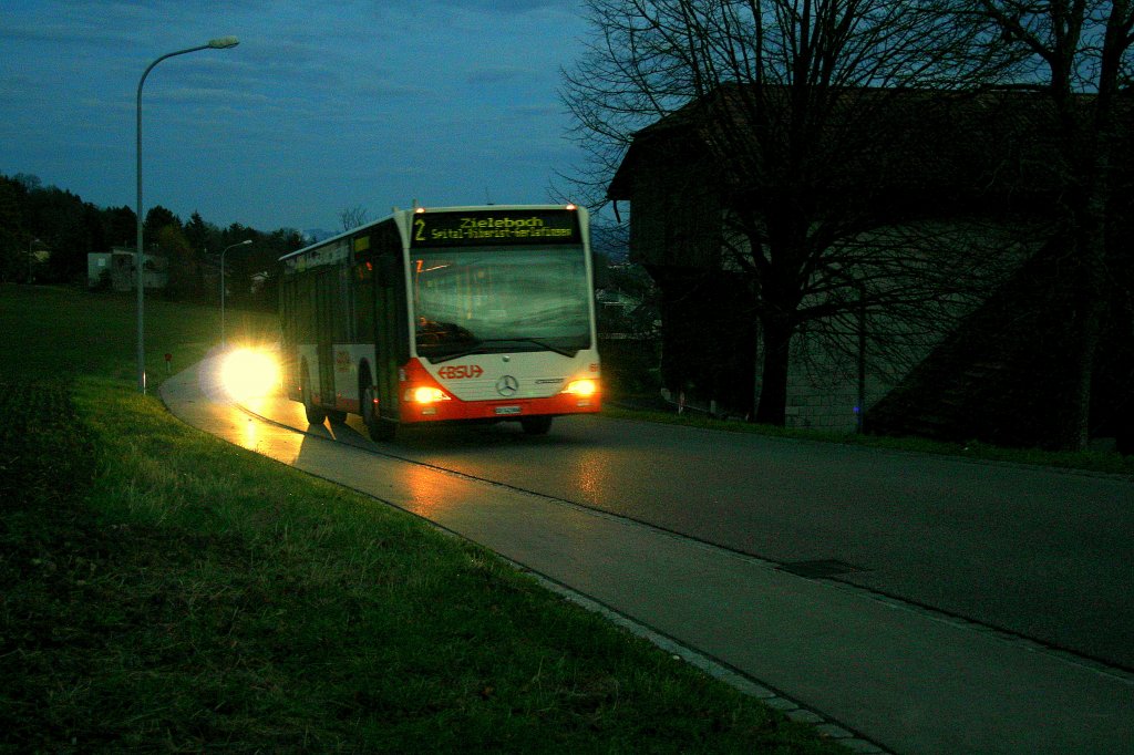 BSU-Wagen 66 (SO 142'066) am 14.11.2010 unterhalb der Endstation Bellach Hubel. Die Aufnahme entstand kurz nach Sonnenuntergang.