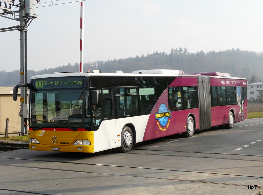 Postauto - Mercedes Citaro  BE 615605 auf dem Bahnhübergang in Aarberg am 16.01.2011