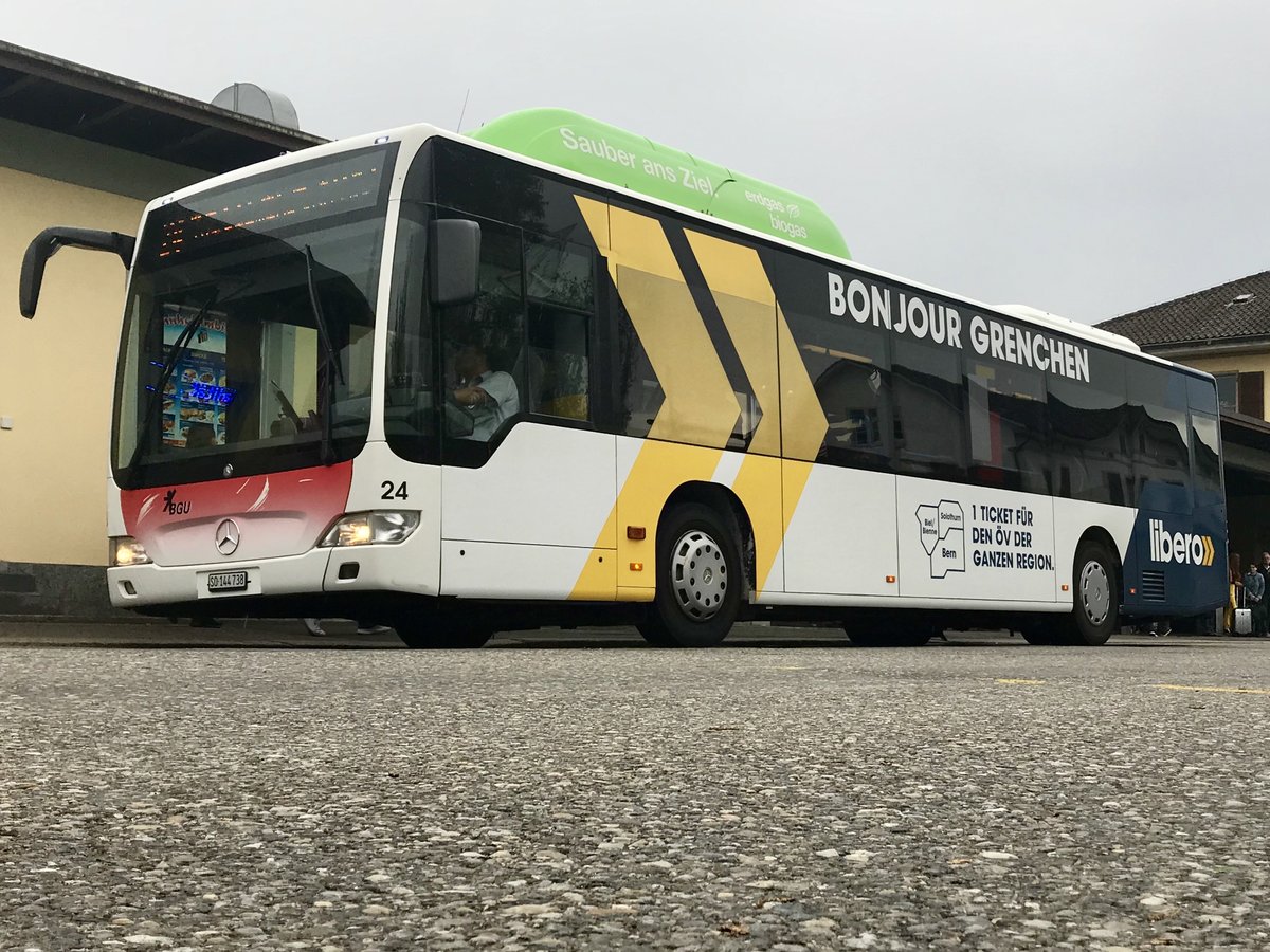Der BGU Facelift Vollwerbebus Nr. 24 am 23.4.17 am warten beim Bhf Grenchen Süd.