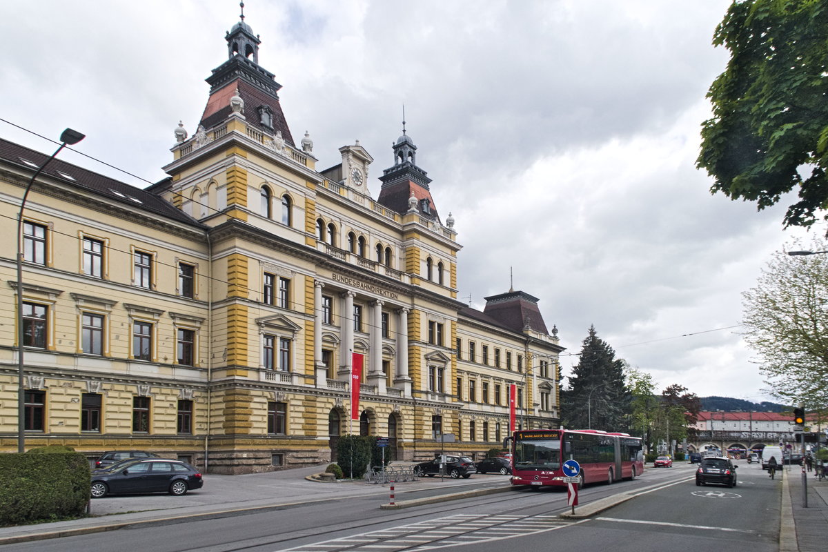 Innsbruck: Bus Nr. 424 der IVB als Schienenersatzverkehr für die Straßenbahnlinie 1 an der Haltestelle Bundesbahndirektion. Aufgenommen 6.5.2019.