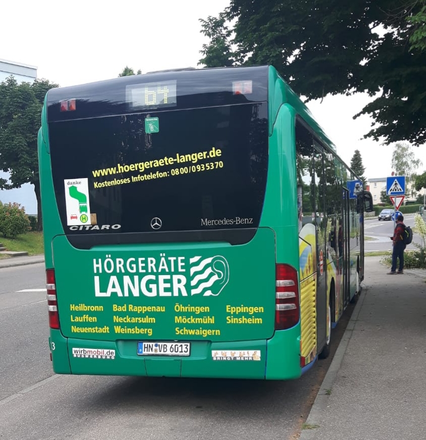 HN-VB-6013/Wagen 13(Baujahr 2009, Euro 5) der Stadtwerke Heilbronn steht an der Endhaltestelle der Linie 64 (Flein, Talheimer Straße) und wirbt für Hörgeräte Langer.