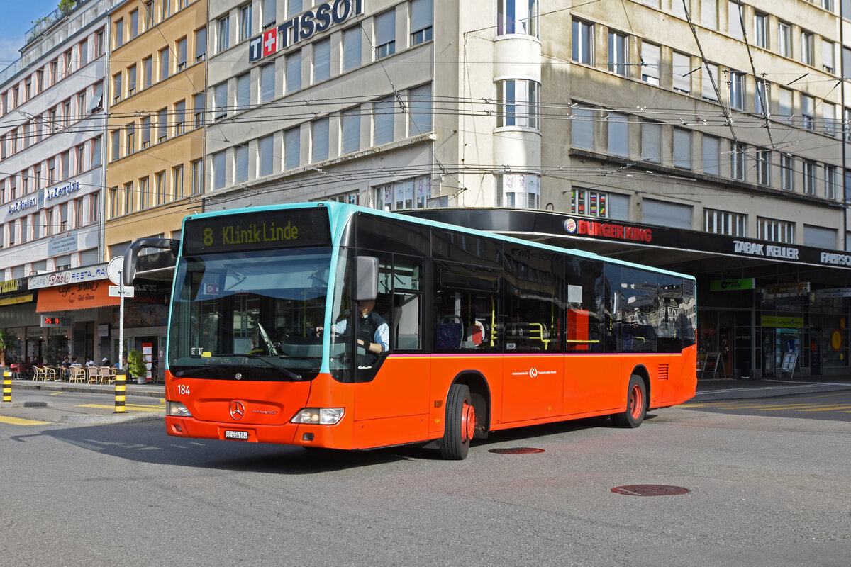 Mercedes Citaro 184, auf der Linie 8, fährt zur Haltestelle beim Bahnhof Biel.