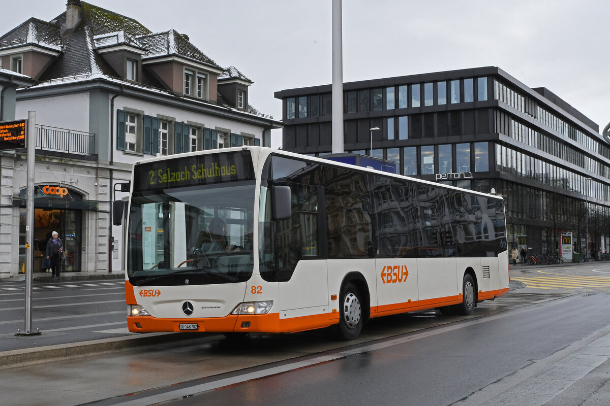 Mercedes Citaro 82, auf der Linie 2 wartet am 18.01.2023 an der Haltestelle am Bahnhof Solothurn.