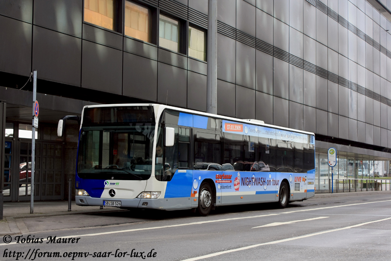 22.03.2009: SB-SB 526 der SaarBahn steht auf der Warteposition am SaarCenter. Auch stammt aus der letzten Dieselbus Lieferung an die SaarBahn. Nur seine Werbung geht ein wenig nach...