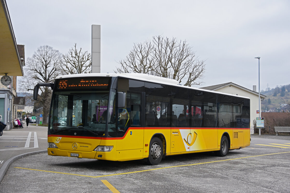 Mercedes Citaro der Post, auf der Linie 135, wartet am 09.02.2026 beim Bahnhof Frick.