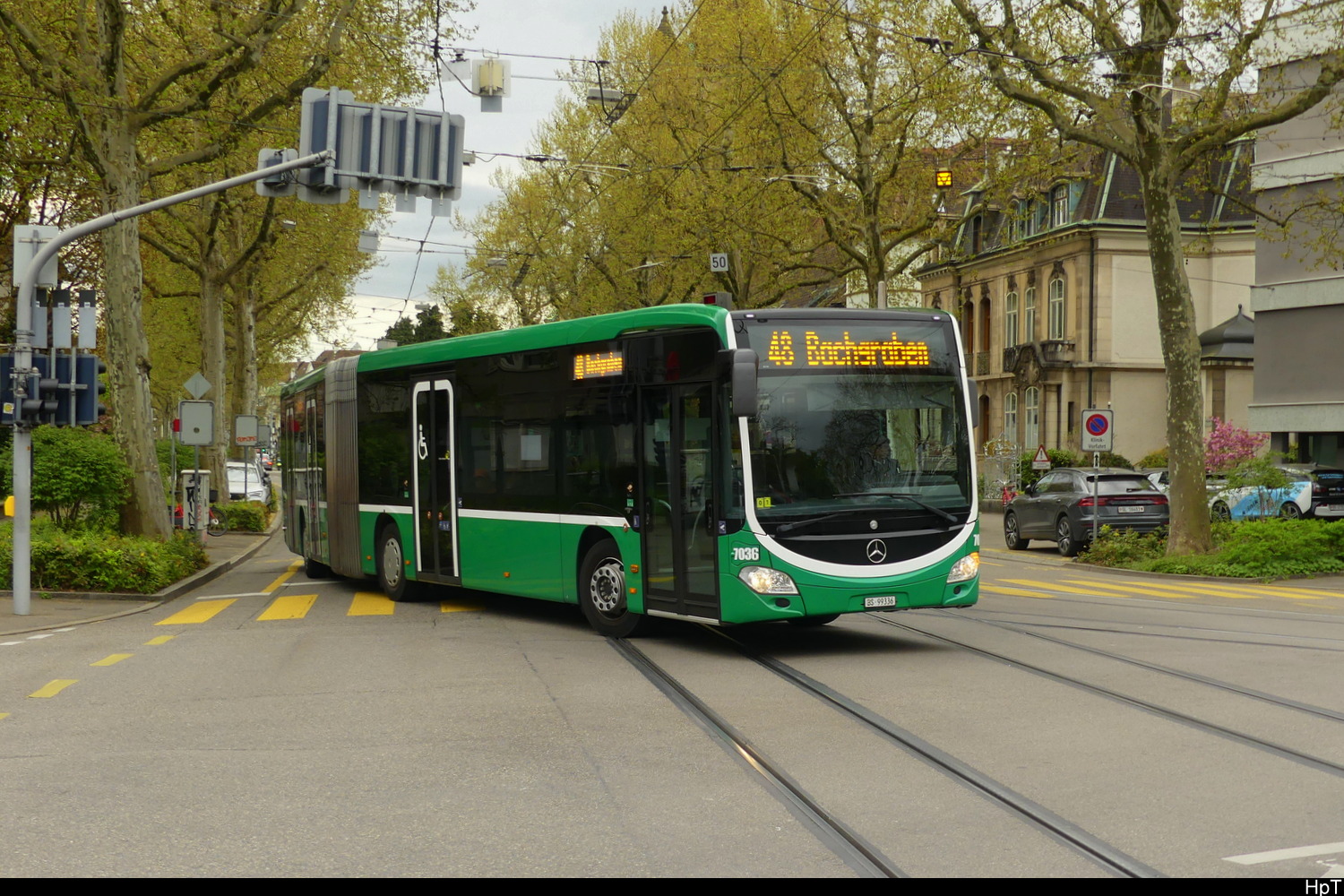 BVB - Mercedes Citaro Nr.7036  BS 99336 unterwegs auf der Linie 48 in Basel am 10.04.2026 .. Standort des Fotografen in der Strassenbahn Haltestelle Schützenhaus