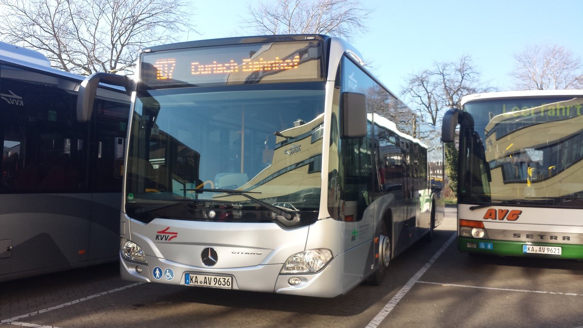 Hier steht der KA AV 9636 der AVG bereit für seinen Dienstanfang auf der Buslinie 107 zum Durlach Bahnhof. Gesichtet am 14.02.2018. in Ettlingen.