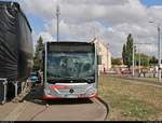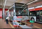 Mercedes-Benz O530 Citaro 2, Wagen 520 "Peter Sodann" (HAL-R-520), der Halleschen Verkehrs-AG (HAVAG) steht zum Tag der offenen Tore auf einer Hebebühne im HAVAG-Betriebshof Freiimfelder Straße.