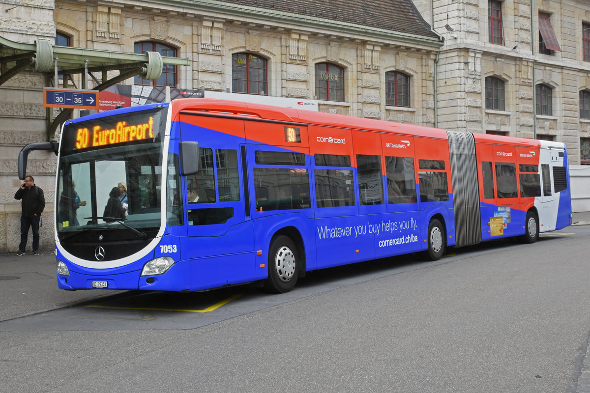 Mercedes Citaro 7053 mit einer Werbung für die Cornercard und British Airways, auf der Linie 50, wartet an der Endstation am Bahnhof SBB. Die Aufnahme stammt vom 03.10.2018.