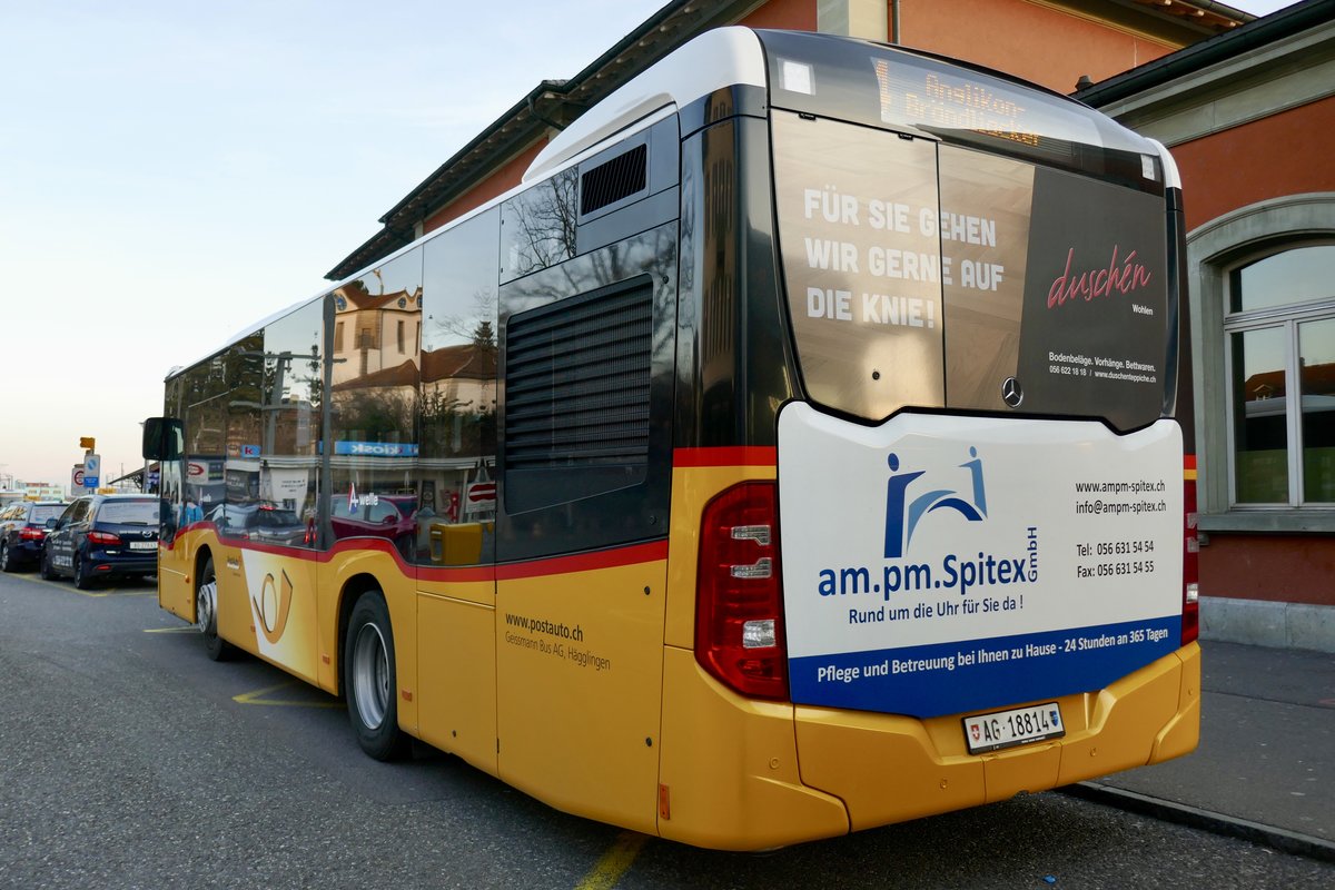 Heckansicht des PostAuto MB C2 K "Wohlen" vom PU Geissmann, Hägglingen am 21.3.19 beim Bahnhof Wohlen.
