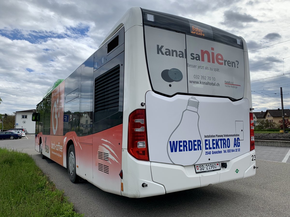 Heckansicht vom BGU MB C2 Nr. 23 am 10.5.19 beim Bahnhof Busswil am warten.