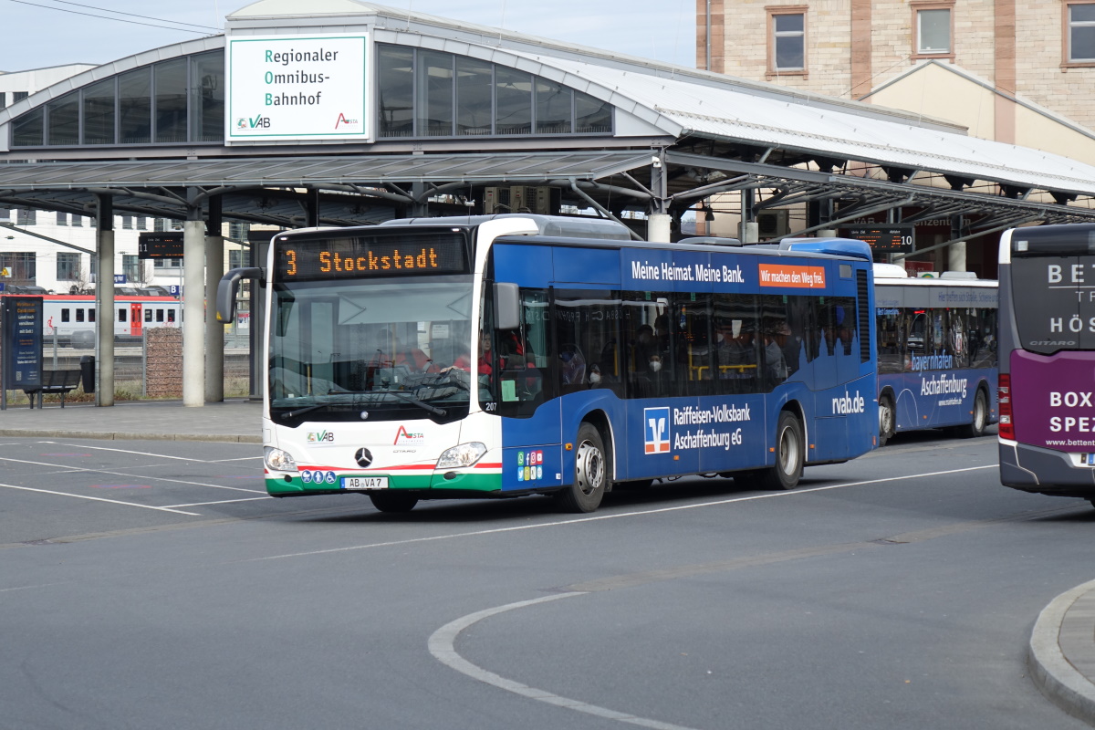 Stadtwerke Aschaffenburg / Wagen 207 (AB-VA 7) / Aschaffenburg, Hauptbahnhof/ROB / Mercedes-Benz O 530 C2 hybrid / Aufnahemdatum: 20.03.2021 / Werbung: Raiffeisen-Volksbank Aschaffenburg eG