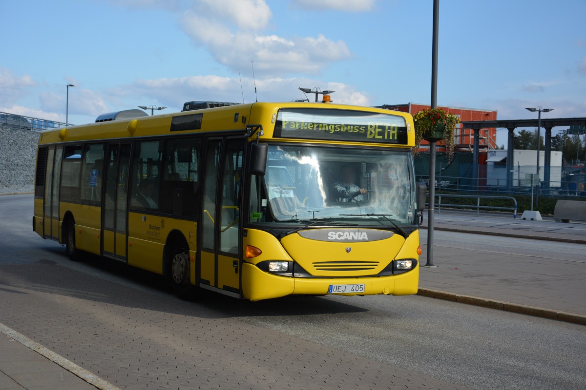 AND 853 (Scania OmniLink) ist eingesetzt als Shuttle zwischen Parkplatz und Arlanda Flughafen Stockholm. Aufgenommen am 13.09.2014.