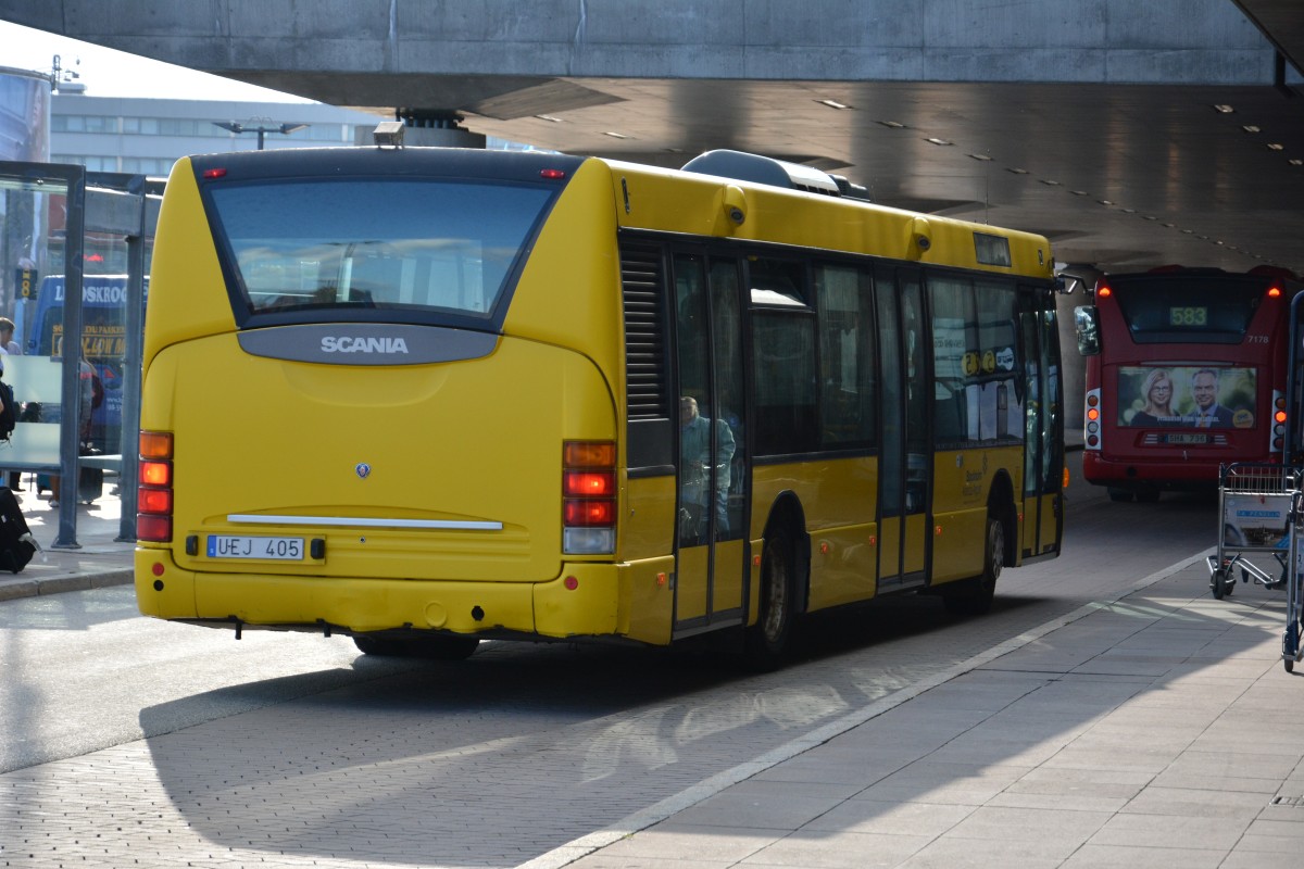 AND 853 (Scania OmniLink) ist eingesetzt als Shuttle zwischen Parkplatz und Arlanda Flughafen Stockholm. Aufgenommen am 13.09.2014.