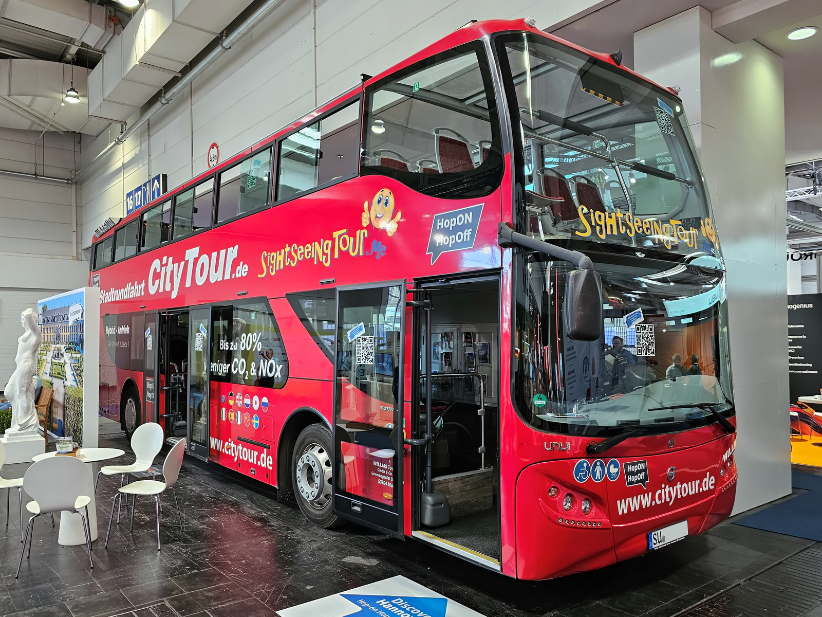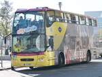 Ein Volvo UNVI Urbis Sightseeing-Bus war Teil der Ausstellung der Messe Hannover, so gesehen Anfang April 2025.