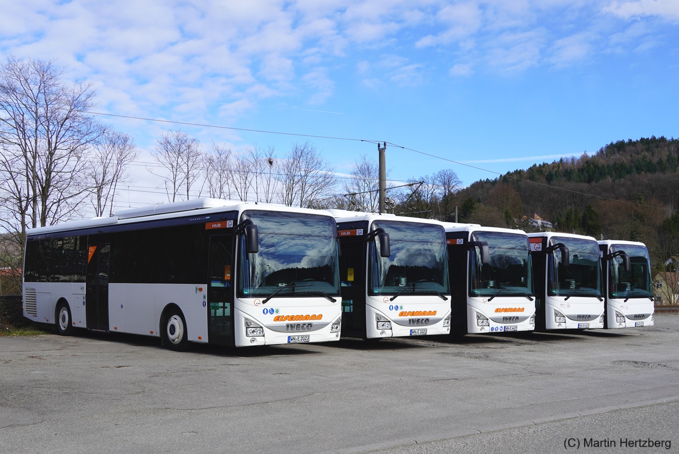 Iveco Bus Crossway LE "Eisemann" und "OVR Omnibus-Verkehr Ruoff", Bahnhof Murrhardt Februar 2024