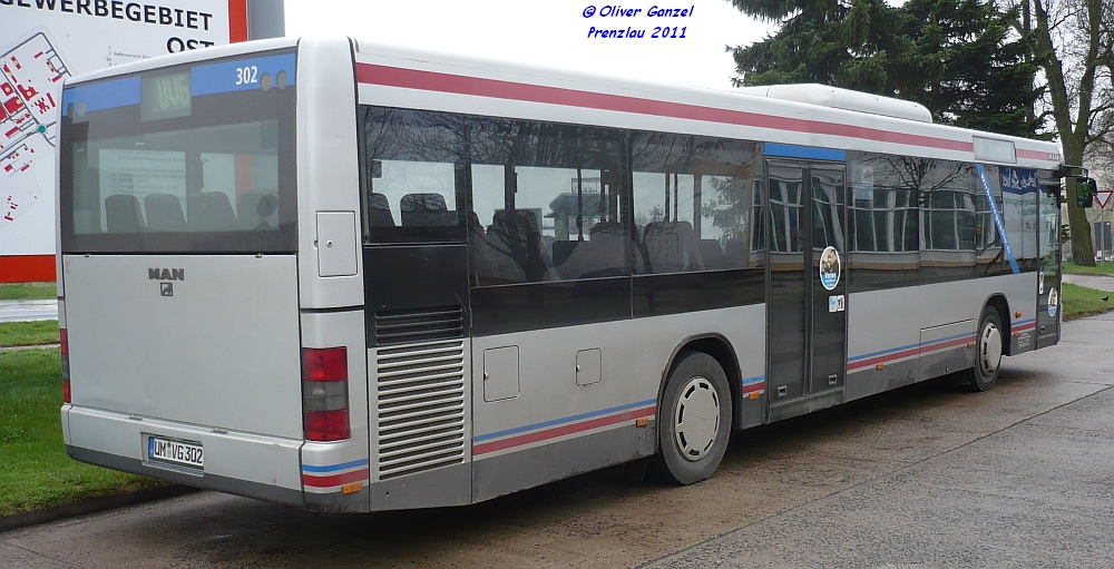 MAN NÜ 313, Wagennummer 302, der Uckermärkischen Verkehrsgesellschaft mbH, 2011 im Gewerbegebiet AWP in Prenzlau.