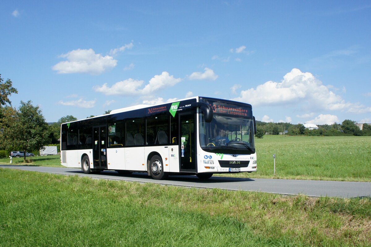 Bus Erzgebirge: MAN Lion's City Ü (ERZ-RV 154) der RVE (Regionalverkehr Erzgebirge GmbH), aufgenommen im August 2023 in Waschleithe, einem Ortsteil der Stadt Grünhain-Beierfeld.