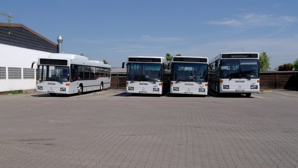 Ein Teil der Busflotte von Busverkehr Zipper GmbH, bestehend aus zwei Mercedes-Benz O 405 NÜ, einem O 405 N CNG mit Erdgasantrieb und einem O 407, stand am 18.5.12 auf dem BVZ Betriebshof in Grünstadt.