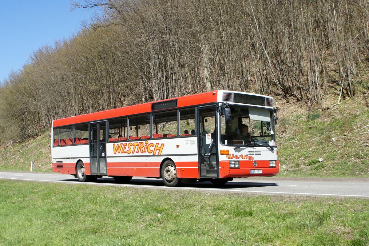 Bus Rheinland-Pfalz: Mercedes-Benz O 407 (BIR-WR 78) vom Omnibusbetrieb Westrich Reisen GmbH, aufgenommen im April 2021 in der Nähe von Herrstein, einer Ortsgemeinde im Landkreis Birkenfeld.