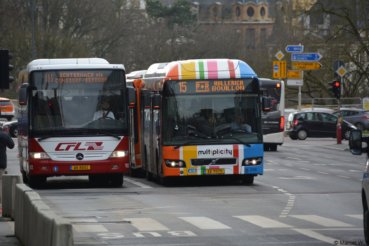 XE 7075 + WK 8661 fährt am 03.02.2019 auf der Linie 15 und 111 durch Luxemburg Stadt. Aufgenommen wurde ein Volvo 7700 und Mercedes Benz Integro.