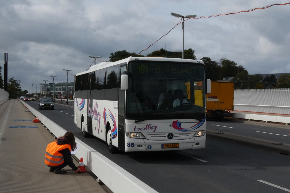 VB 8860, Mercedes Benz Integro von Voyages Bollig, auf der Roten Brücke in der Stadt Luxemburg, auf welcher an diesem Tag Vibrationsvermessungen durchgeführt werden. 04.10.2017