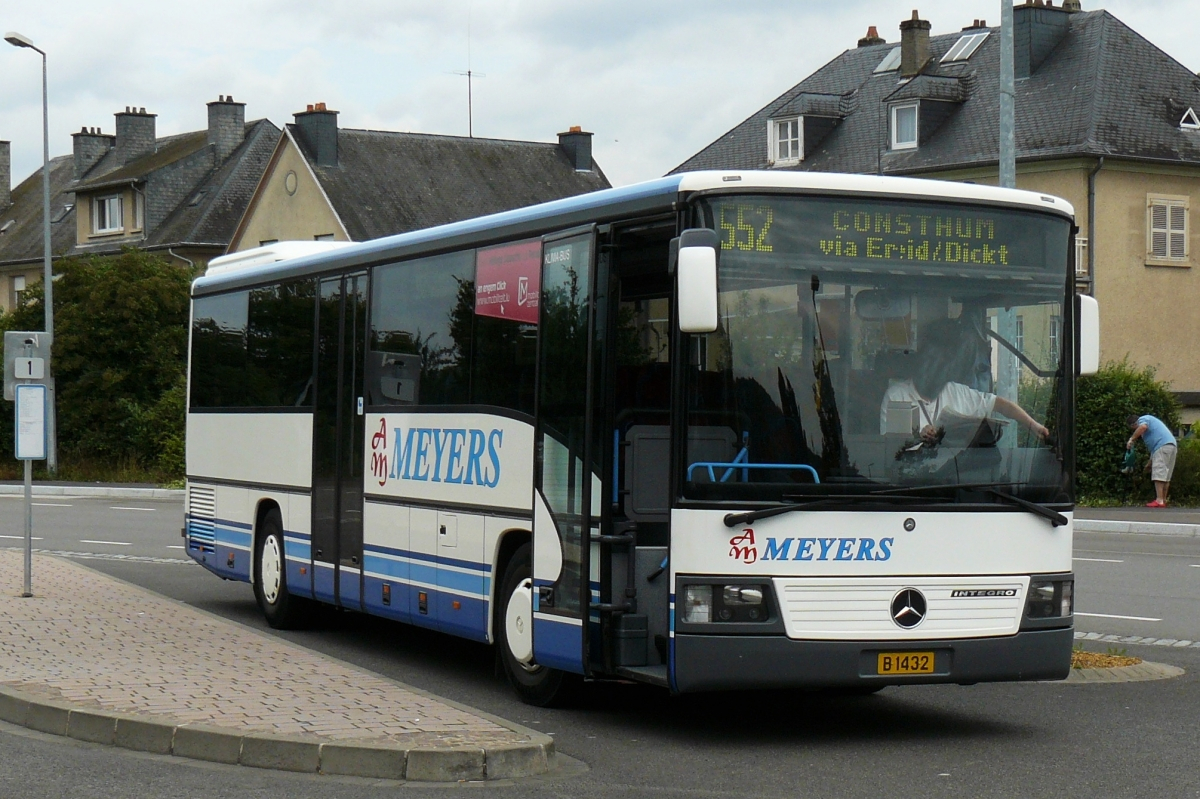 B 1432, Mercedes Benz Integro von Autocars Meyers, steht am Bushaltestelle einer Schule in Diekirch. 04.08.2012