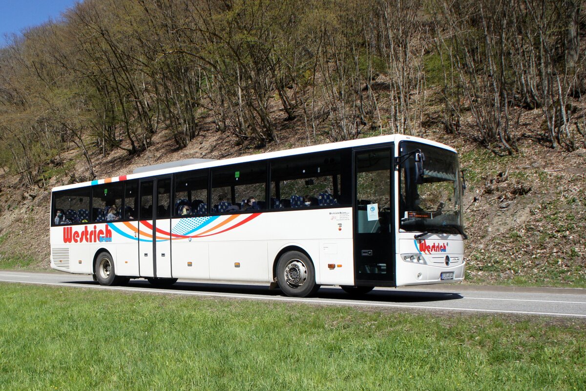 Bus Rheinland-Pfalz: Mercedes-Benz Intouro (BIR-WR 48) vom Omnibusbetrieb Westrich Reisen GmbH, aufgenommen im April 2021 in der Nähe von Herrstein, einer Ortsgemeinde im Landkreis Birkenfeld.