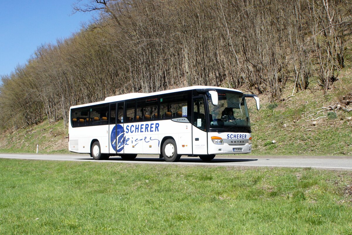 Bus Rheinland-Pfalz: Setra S 415 UL-GT (SIM-SR 348) von Scherer Reisen, aufgenommen im April 2021 in der Nähe von Herrstein, einer Ortsgemeinde im Landkreis Birkenfeld.