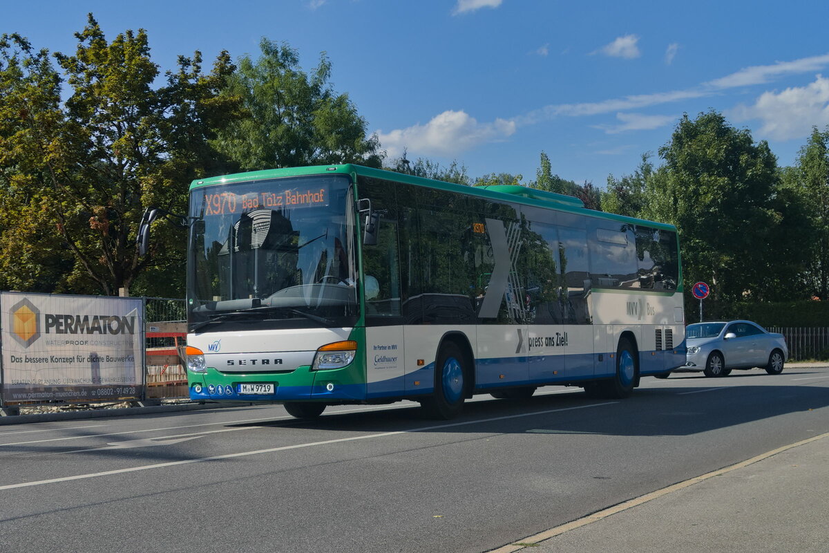 Setra S 415 LE business von Geldhauser (M-W 9719) als Linie X970 in Wolfratshausen, Sauerlacher Straße. Aufgenommen 25.8.2022.