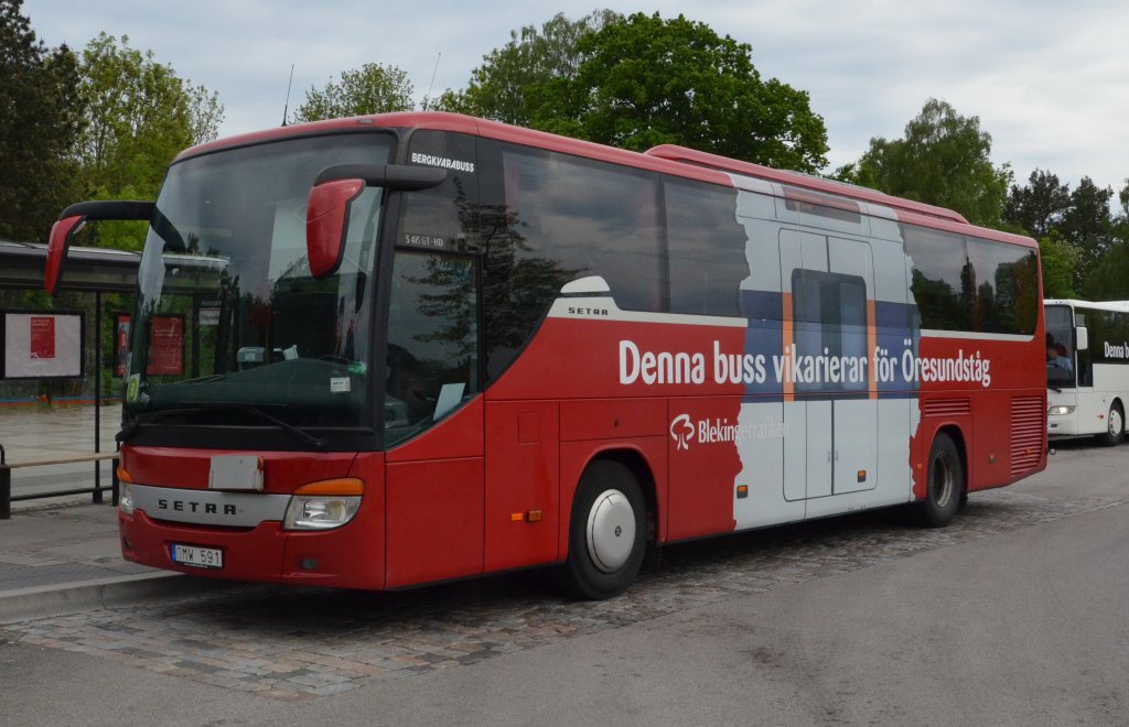 Ein Setra S 415 GT-HD. Dieser Reisebus-Hochdecker der ComfortClass ist hier als Überland-Linienbus, von Blekingetrafiken im Einsatz am Bahnhof Karlshamn/Schweden. Gesehen am 26.05.2012.