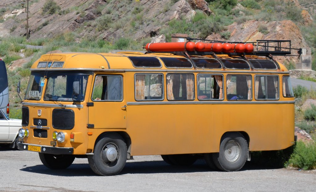 Das Modernste an diesem allgegenwärtigen Bus in Armenien ist die Umstellung auf Gasbetrieb. Fotografiert nahe der türkischen Grenze in Khor Virap