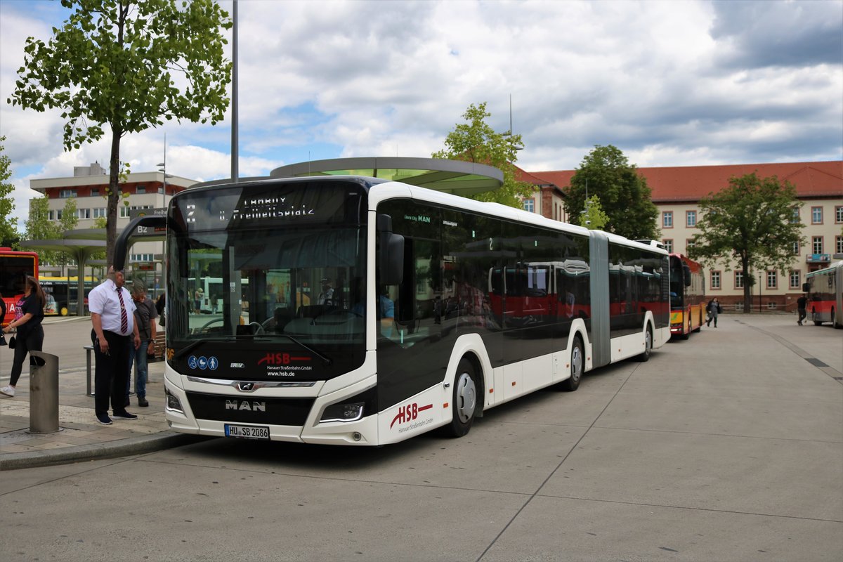 Der erste MAN Lions City G Wagen 86 im Fuhrpark der Hanauer Straßenbahn am 03.07.20 in Hanau Freiheitspatz