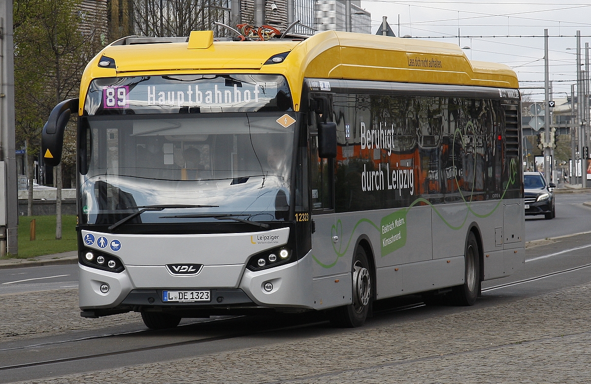 12323 der Leipziger Verkehrsbetriebe fährt rein elektrisch. Aufnahme vom 16.04.2022 am Bahnhofplatz Leipzig