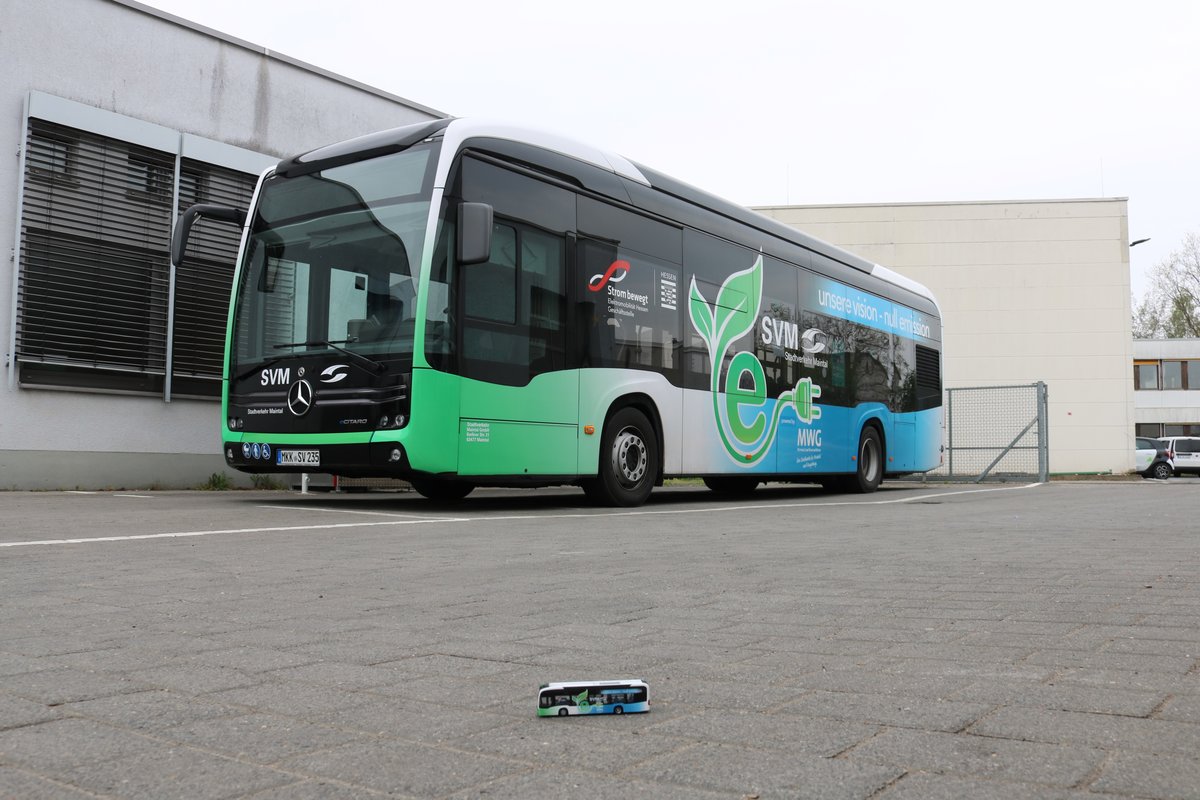 Mdoell trifft Original. Hier zu sehen das 1:87 Modell des Mercedes Benz eCitaro des Stadtverkehr Maintal und das Original am 30.04.21. Ein Mitarbeiter hat es mir erlaubt die Fotos auf den Betriebshof zu machen