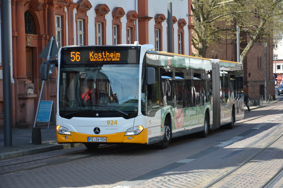 Am 21.04.2016 fährt MZ-SW 924 auf der Linie 56 nach Kostheim. Aufgenommen wurde ein Mercedes Benz Citaro G II / Mainz Innenstadt.