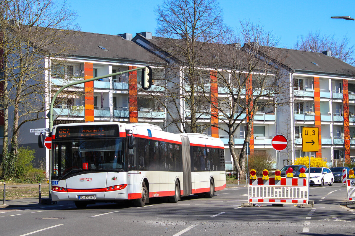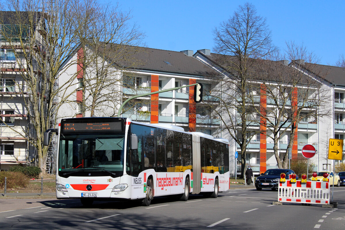 Stadtwerke Neuss 224 "Hagebaumarkt Sturm", Mercedes-Benz C2 G Baujahr 2015, auf dem Weg nach Weckhoven in der Umleitung über die Fesserstraße, 28.2.2022, Fesserstraße