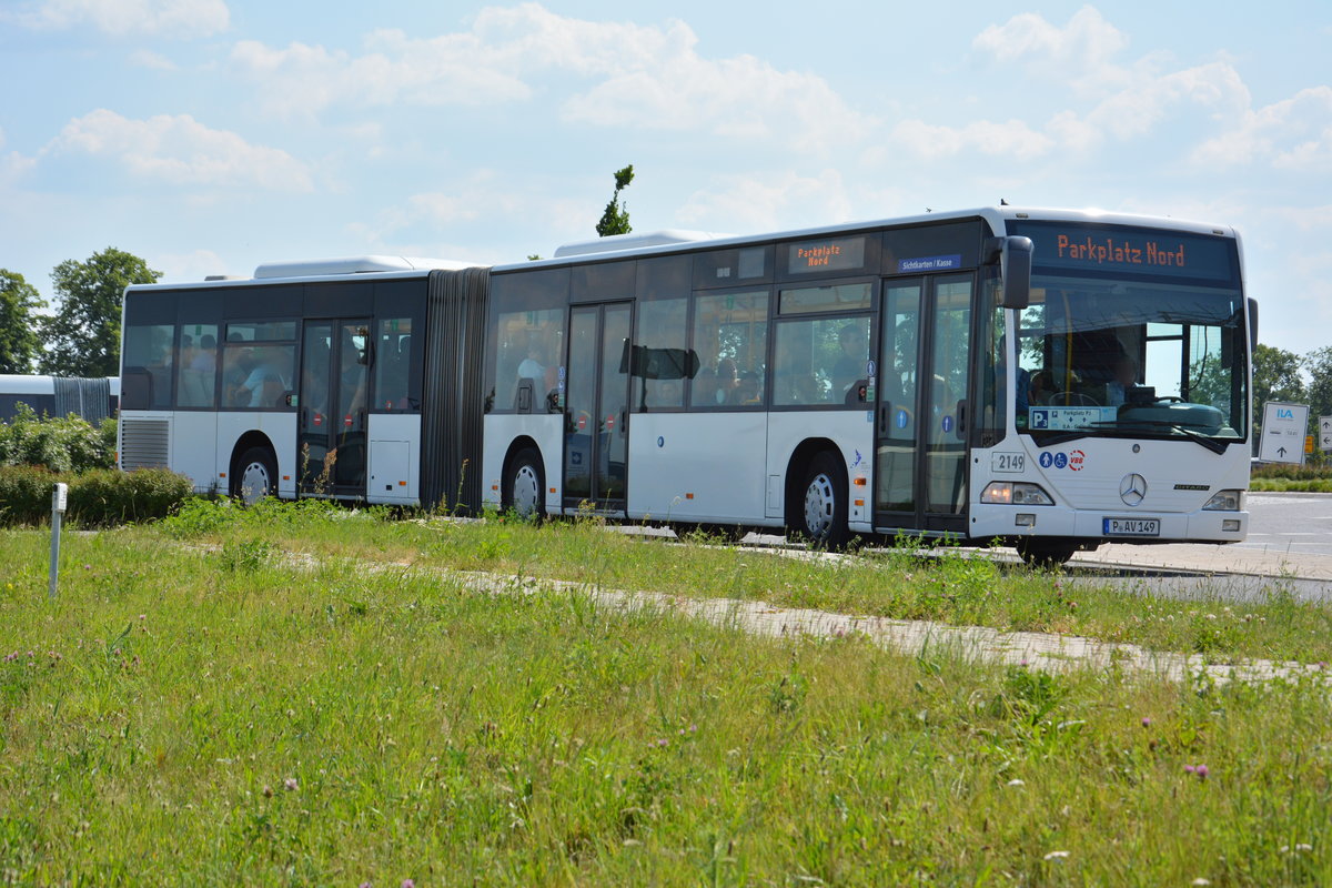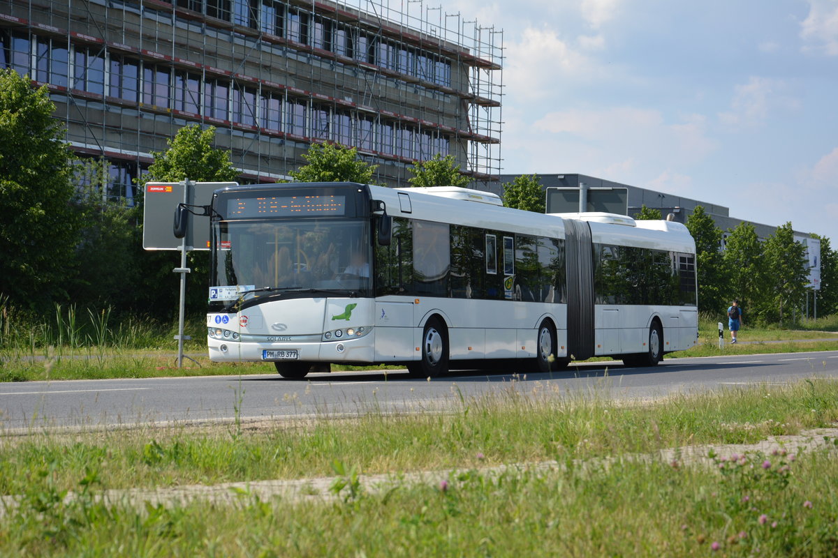 Am 04.06.2017 fährt P-AV 195 für die ILA 2016 auf der ILA Sonderlinie P3 zwischen Parkplatz P3 und ILA-Gelände. Aufgenommen wurde ein Solaris Urbino 18 der BVSG (Betriebshof Potsdam).