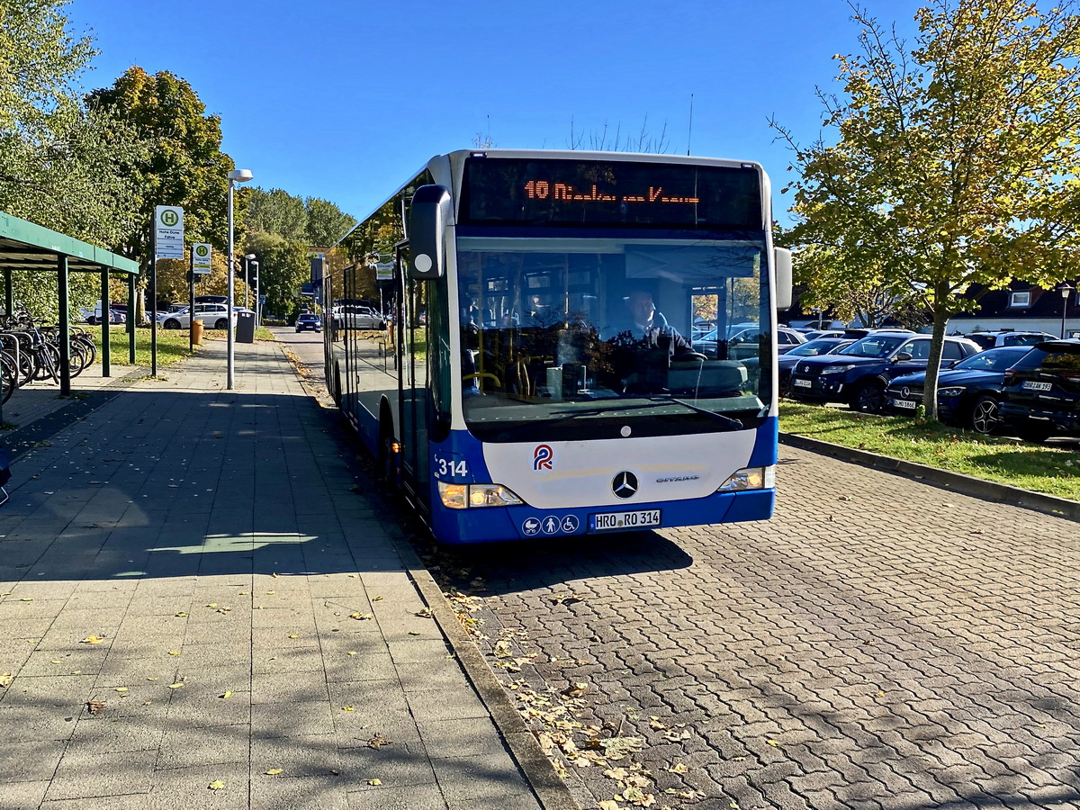 18. Oktober 2025, Warnemünde Abreise hier mit Mercedes Benz Citaro der RSAG Rostock - Wagen 314 von der Haltestelle Warnemünde Hohe Düne Fähre.